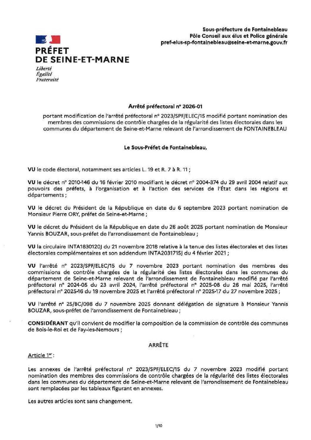 Les membres de la Commission de contrôle des listes électorales, chargée de la régularité des listes électorales, ont été nommés par l’arrêté préfectoral du 23 janvier 2026.