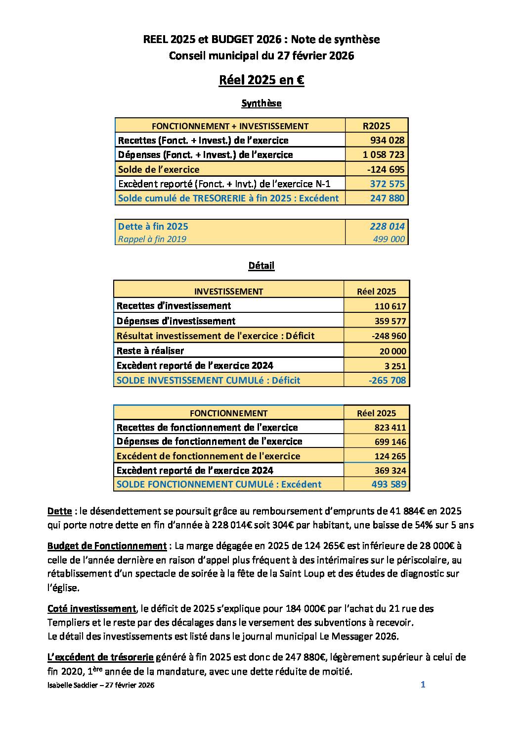 Une note de synthèse a été rédigée à l’attention des élus et des habitants, pour commenter le Réel 2025 et le Budget 2026.