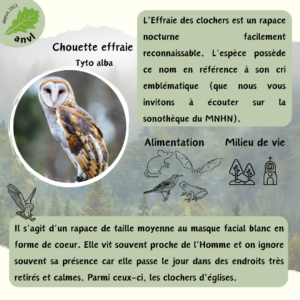 « L’Eglise du village accueille une fée blanche aux cris étranges : l’Effraie des clochers ! Lors de cette après-midi, venez en apprendre davantage sur son mode de vie et les services qu’elle rend aux écosystèmes, en analysant les proies que mangent le couple valdéen ».