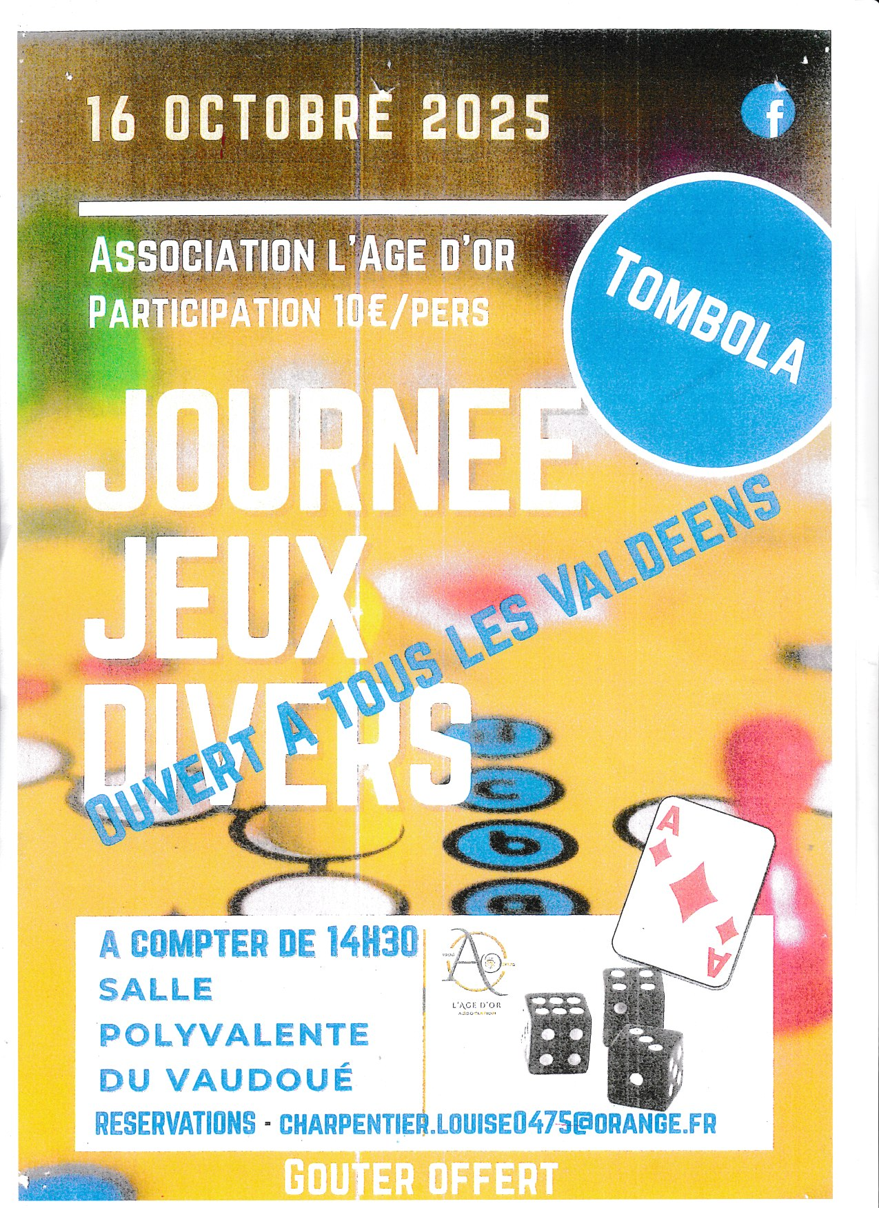 L’association L’âge d’or organise des jeux divers, avec tombola, ouverts à tous les valdéens et valdéennes le jeudi 16 octobre 2025 à compter de 14h30 à la salle polyvalente. Gouter offert.